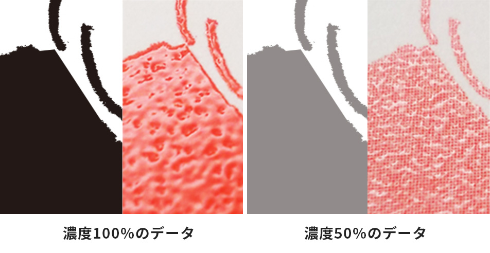 しっかりとツヤプリの効果を出したい部分は、濃度を100%でお作りください。(全面ベタなどベタ範囲が広い場合は90%~80%に濃度を下げてください。)