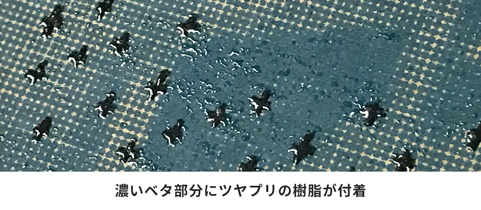 印刷の薄い部分は樹脂が乗りにくいため、隆起効果がまばらとなりツヤツヤ感が分かりづらくなります。
