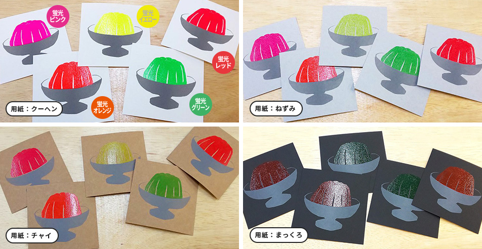 特に黒系の用紙に蛍光・パステル系インクへのツヤプリは、発色が大きく変わるため、事前の試し刷りをおすすめします。