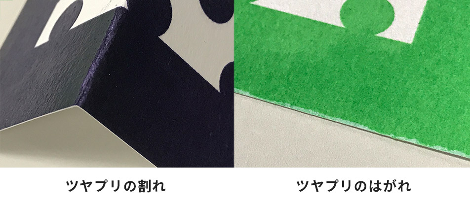 ツヤプリのベタ部分は、断裁や折り曲げによってひび割れやはがれ・汚れが発生することがあります。裁ち落とし位置にツヤプリでベタ印刷をされる場合は、あらかじめご了承ください。