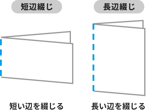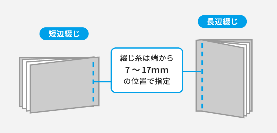 短い方の辺を綴じる「短辺綴じ」と、長い方の辺を綴じる「長辺綴じ」があります。綴じ糸の位置は紙端から7~17mmの間でご指定ください。