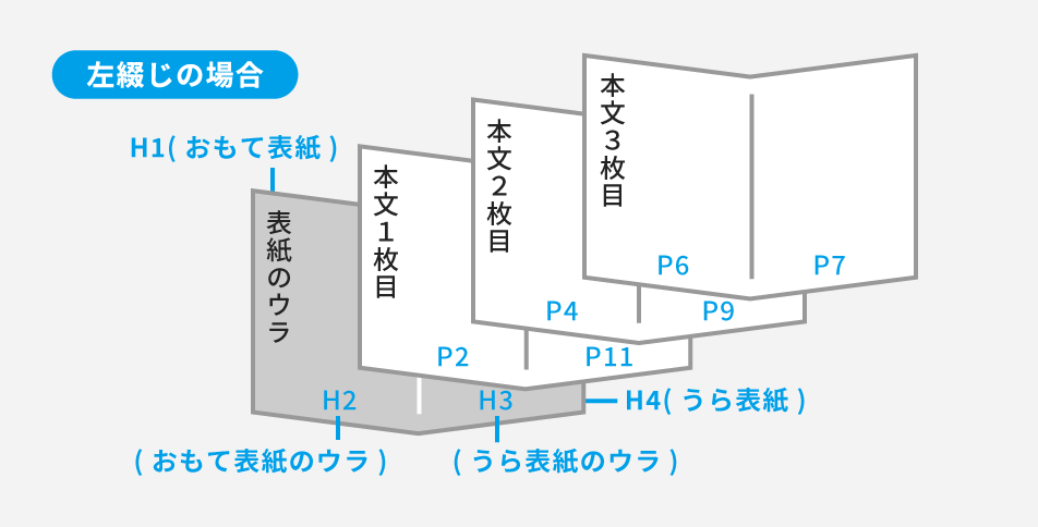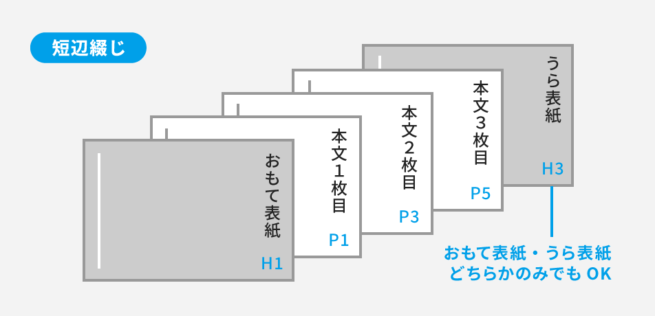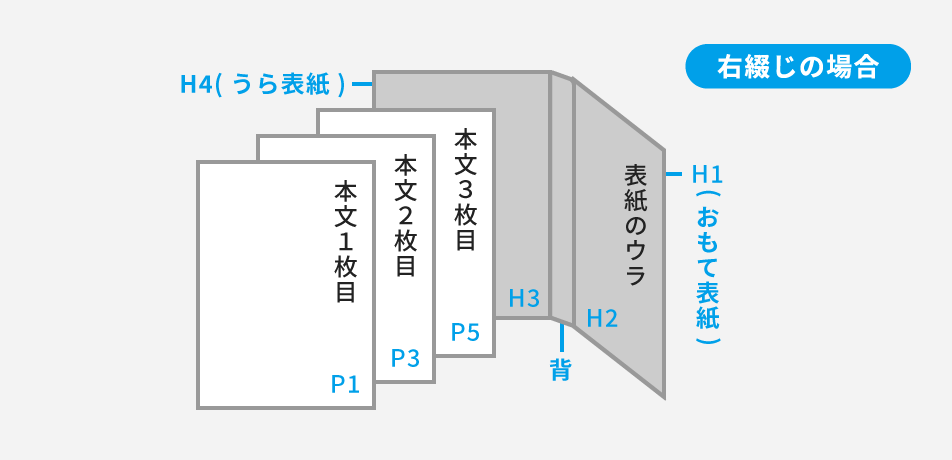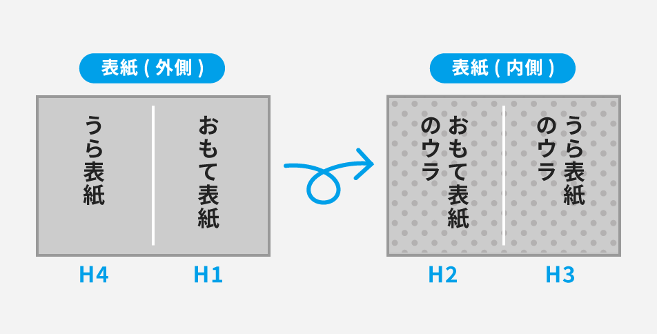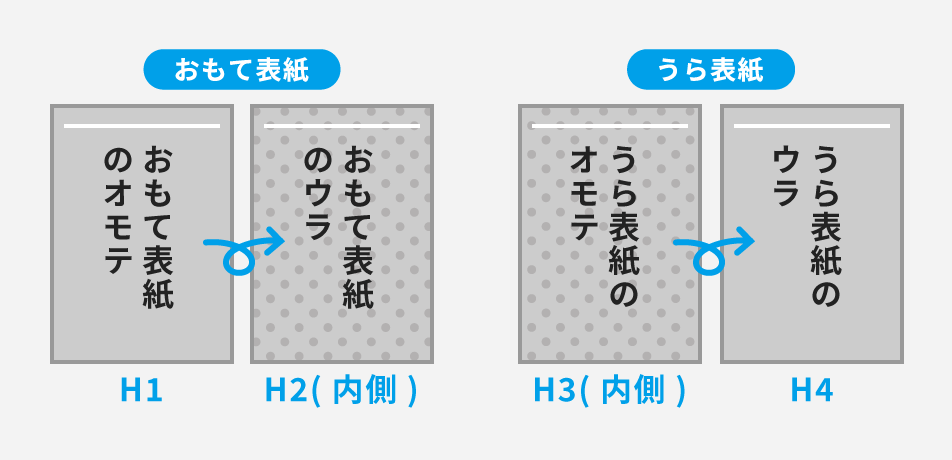 おもて表紙のオモテ(H1)、おもて表紙のウラ(H2)、うら表紙のオモテ(H3)、うら表紙のウラ(H4)の4ページ分が表紙のデータとなります。(表紙は、おもてのみ・うらのみもできます。)