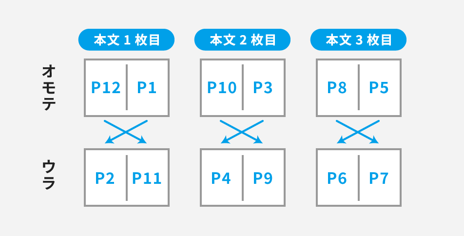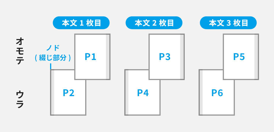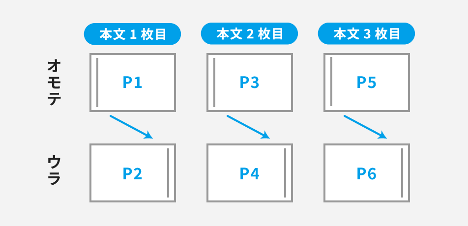 平綴じ製本は、本文1枚でオモテ・ウラの2ページ分となるため、中綴じ製本のようなページ面付は必要ありません。