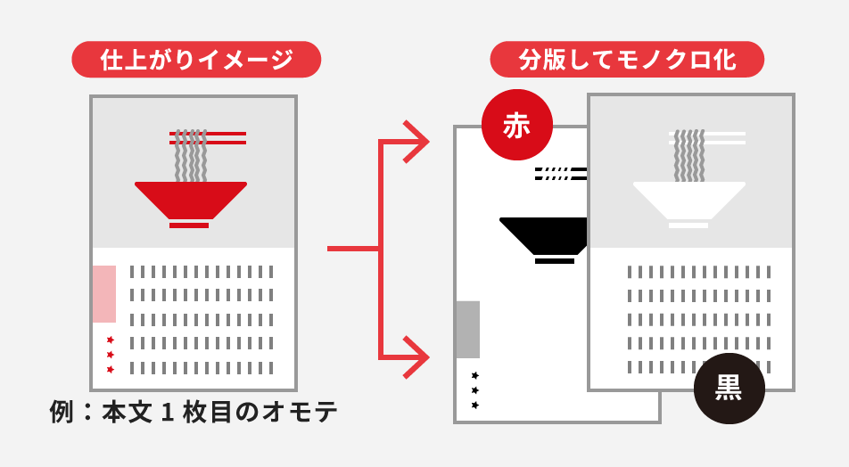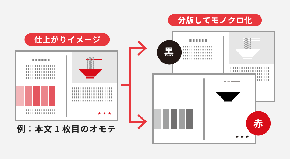 本文1枚ごとにインク・用紙を変えることも可能です。ページにより色数が異なる場合、ご注文フォームに詳細の仕様をご記入ください。印刷なし(白紙)ページのデータは不要です。