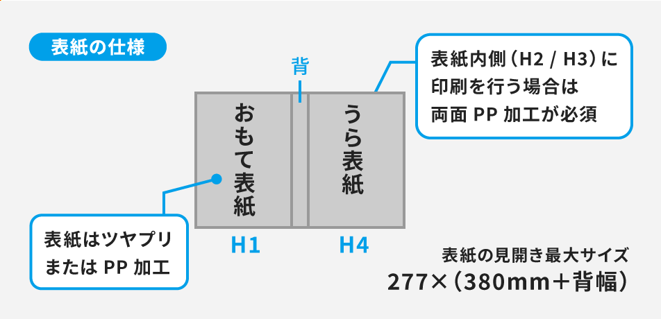 表紙は背幅を含めた見開きの状態で作成します。背幅は本文ページ数によって異なりますのでご注意ください。また、表紙はツヤプリかPP加工のみとなり、表紙の内側(H2-H3)に印刷を行う場合は、厚紙で両面PP加工が必須となります。