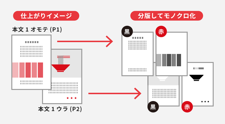 印刷用データは通常のレトロ印刷と同じく、1色につき1ファイルでご入稿ください。綴じたときに外側になる面を「オモテ」、内側になる面を「ウラ」とし、本文1枚に対して、オモテとウラでそれぞれ使用するインクごとに版分けを行います。