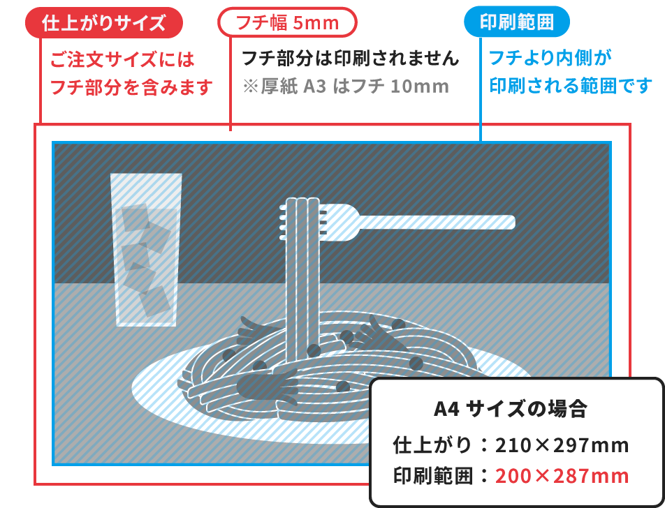 ペラ紙・中厚紙では5mm幅のフチが、厚紙A3サイズでは10mm幅のフチが付きます。フチ部分は印刷されません。