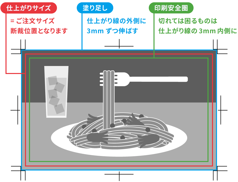 印刷や断裁の際に最大2~3mmのズレが生じるため、切れては困る文字やイラストは、仕上がり位置よりも3mm内側に配置するようにしてください。