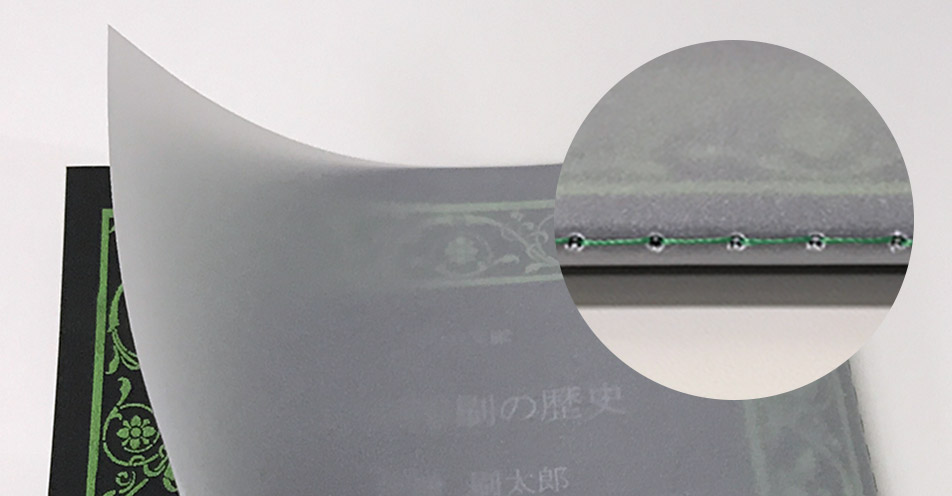 重ねた紙の束を、外側と内側から2本の糸で縫う 「のり無し」 製本と、1本の糸で縫い糸端をのり付けする 「のり有り」 製本があり、予算や仕上がりに応じてお選びいただけます。